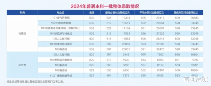 在四川省内,该校物理类各专业组以539分省控线为基础,分数与位次呈现鲜明分层。“101 油气开发组”,最高分626分(位次 12394)、平均分605分(位次23113)、最低分599分(位次26883),作为学校传统优势领域,油气开发相关专业凭借行业积淀与就业前景,聚拢高分数段考生,位次靠前凸显报考热度。“102 空天大数群组”,最高分617分(位次16551)、平均分602分(位次24864)、最低分590分(位次33245),在航空航天、大数据融合趋势下,吸引对前沿领域感兴趣的考生,分数位次随专业适配度与发展潜力形成梯度。“103 智能制造与建造组(成都校区)” 等其余专业组,最低分均为590分、位次33245 ,虽基础门槛一致,但因专业特性,在最高分、平均分位次上有别,反映不同理工科专业对考生的吸引力差异,优势学科专业组凭借学科实力,能吸附更高分数、更优位次考生。